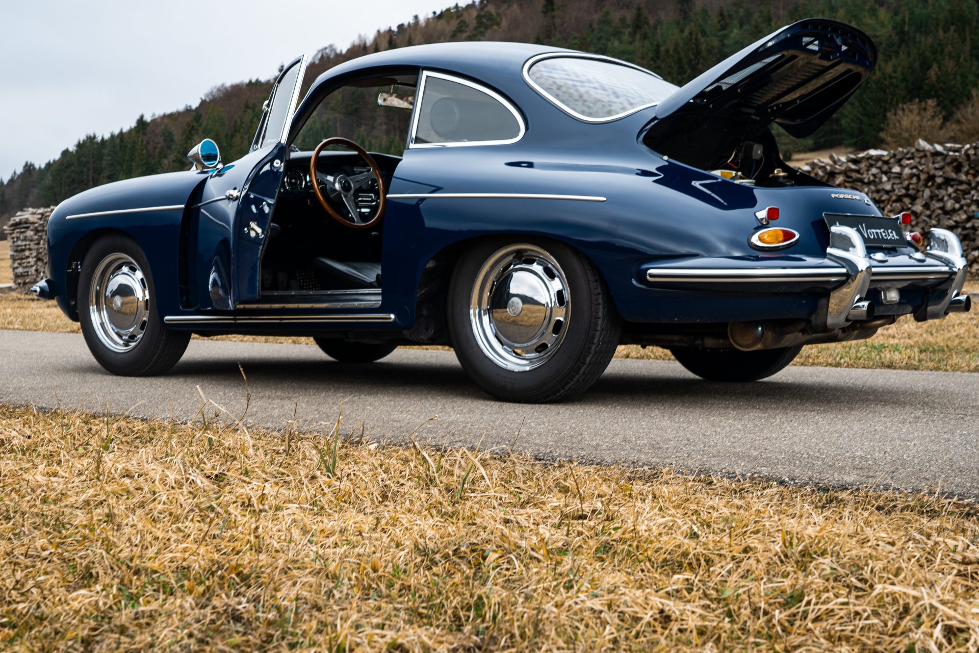 Dieser Porsche 356C besticht durch seine zeitlose Eleganz gepaart mit sportlichen Fahreigenschaften. In der Farbe Baliblau, kombiniert mit prunkvollen Extras wie die Speedster-Zierleisten, den verchromten Lochscheibenrädern sowie Talbot-Spiegel und einem Holzlenkrad präsentiert sich diese Modell besonders ansprechend. Ein herausragendes Merkmal ist außerdem die Leistungssteigerung auf 95PS durch Hubraumerweiterung auf 1720 ccm und 40mm Solex-Vergaser aus dem 356 SC. Im Zuge dieser zeitgenössischen Leistungssteigerung des Matching-Numbers Antriebsstrangs wurde außerdem auf einen Eisenmann-Edelstahl-Schalldämpfer sowie K&N Luftfilter umgebaut. Das Tonspiel ist Musik in den Ohren.