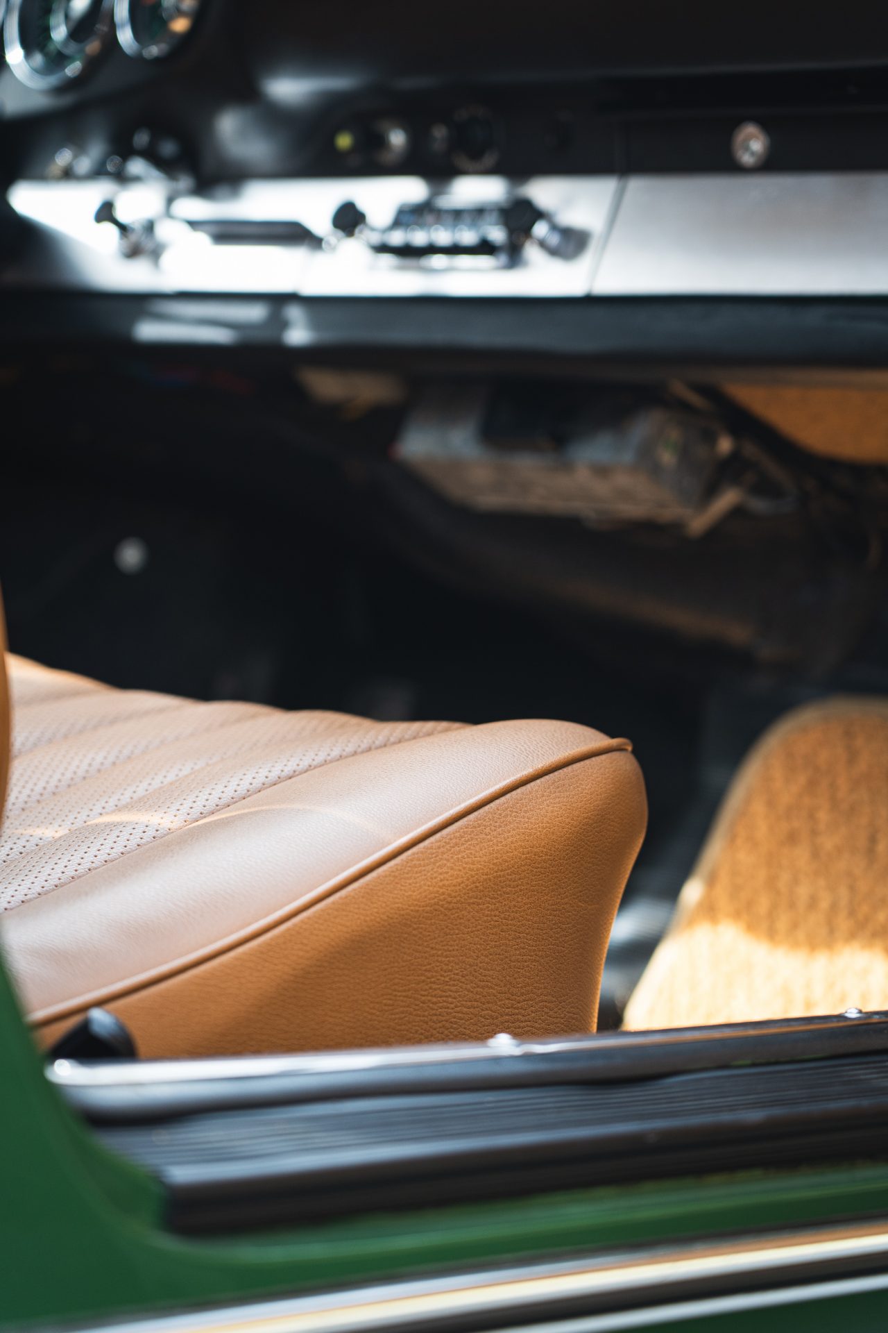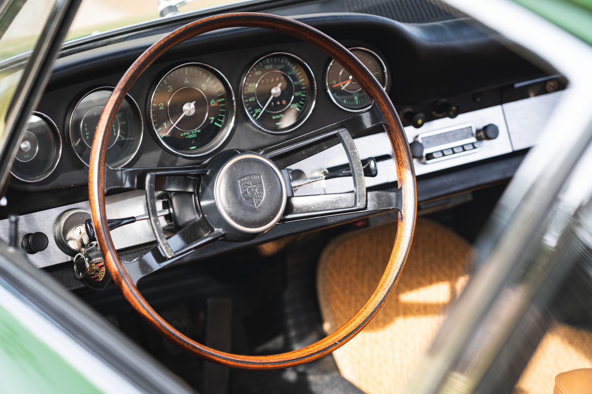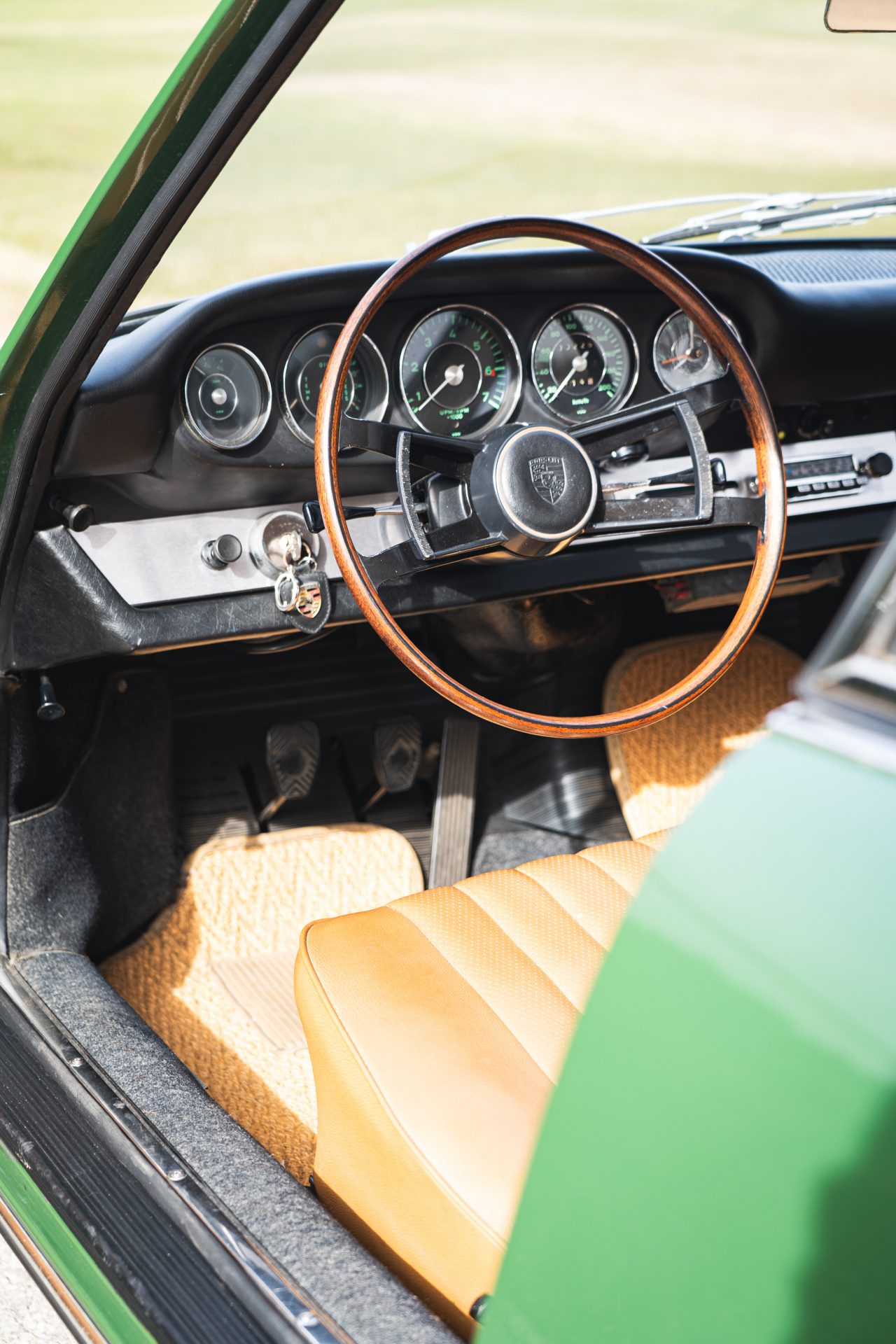 Das Interieur ist in einem sehr gepflegten Zustand und harmonisiert mit den Beige- und Brauntönen perfekt mit dem Außenlack in irischgrün. Das Holzlenkrad ist original. Regelmäßige Wartungen unterstreichen den sehr guten Zustand dieses Porsche 912, der für viel Fahrspaß bei seinem aktuellen Besitzer gesorgt hat.